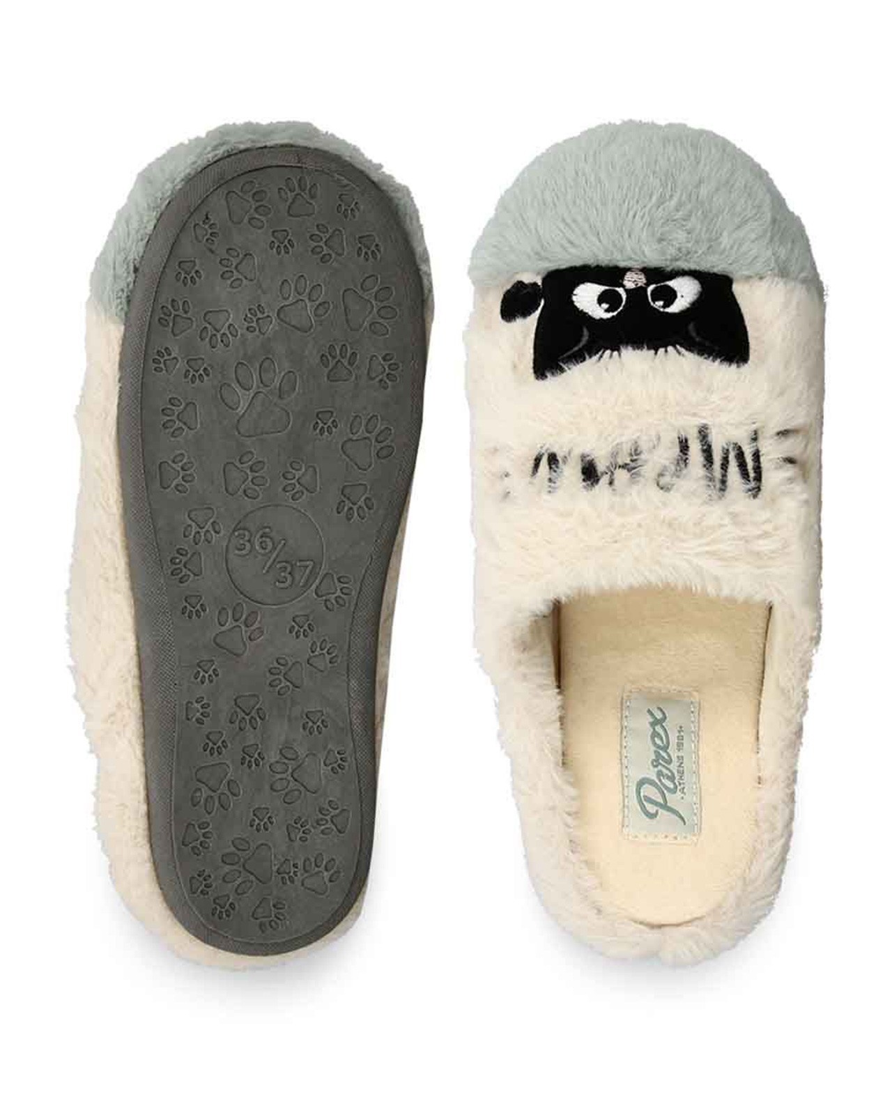Ηouse slippers from fuzzy fabric. This design is featuring a soft insole, and a non-slip and comfortanle outsole. Cat embroidery on top.